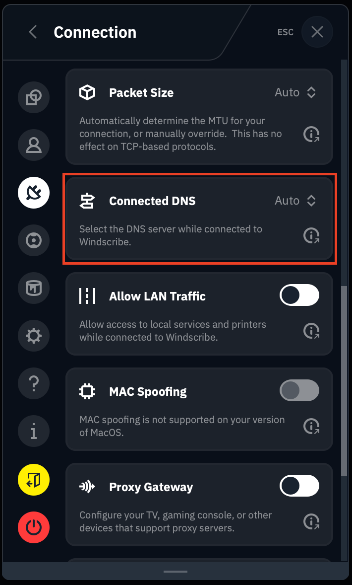 In the Windscribe Desktop application, head to Preferences >> Connection (plug icon) and scroll down to the Connected DNS box: